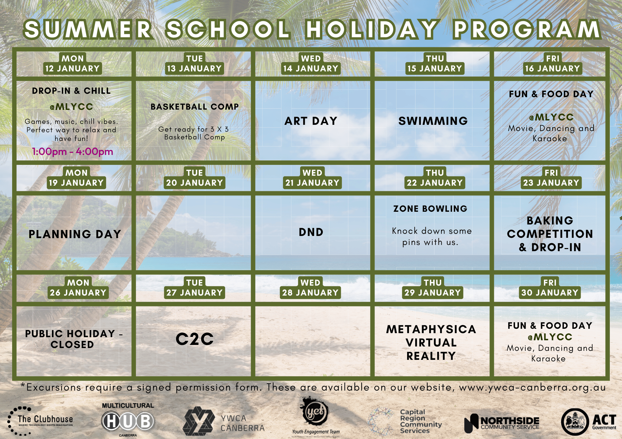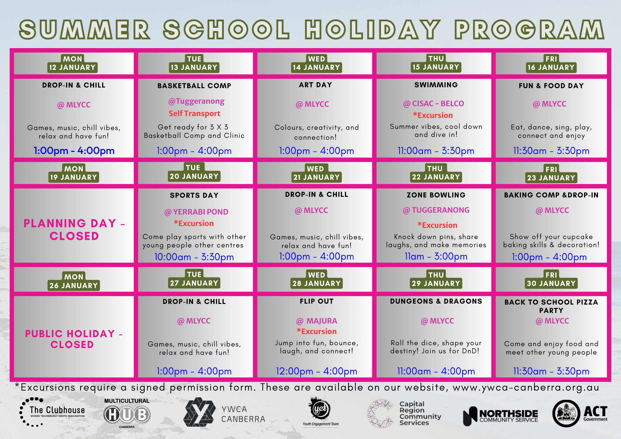 For more information about the school holiday program and to return permission forms, please contact the Youth Programs Team, Youth@ywca-canberra.org.au (02) 6185 2090.